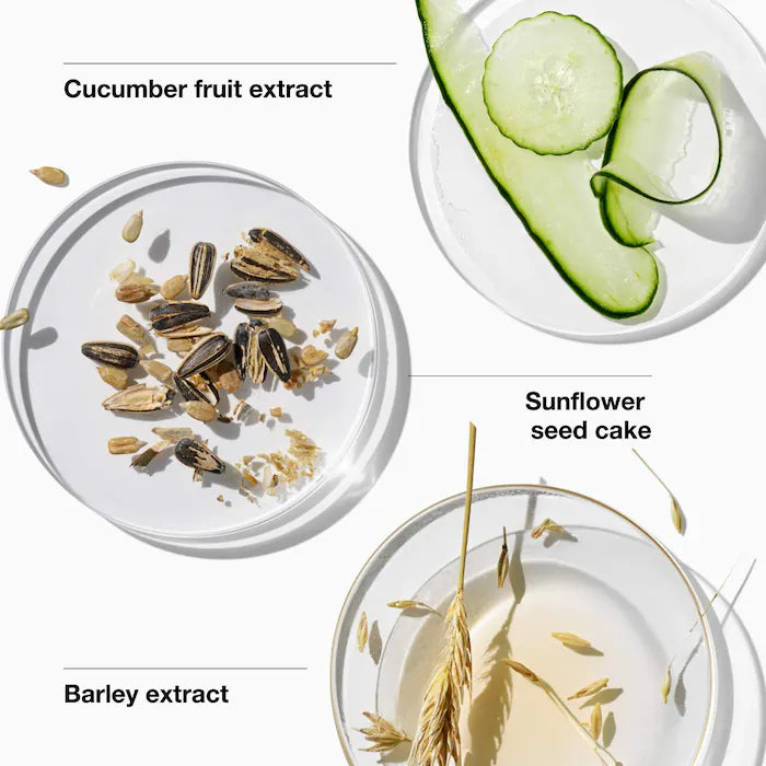 -Sunflower Seed Cake, Barley Extract, and Cucumber Fruit Extract: Help support skin’s barrier, improve its resiliency, and balance and retain skin’s moisture levels.