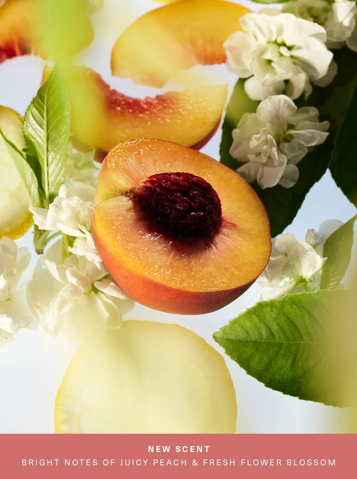 A refreshing fruity-floral blend with notes of peach, soft florals, and warm base notes for a clean, uplifting finish.