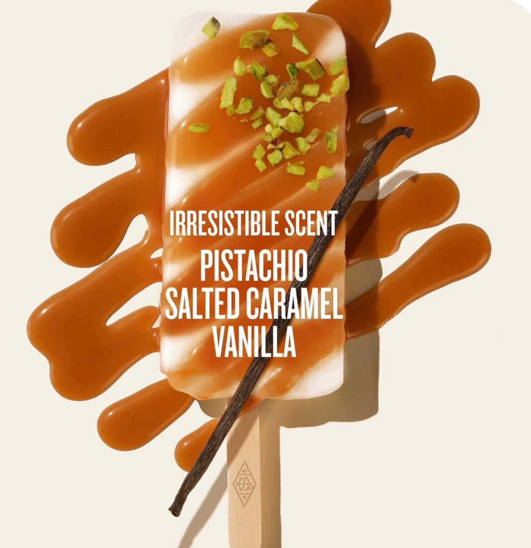 A: It's the brand's signature scent—an irresistible blend of pistachio, salted caramel, and vanilla, designed to transport your senses to the beaches of Brazil.